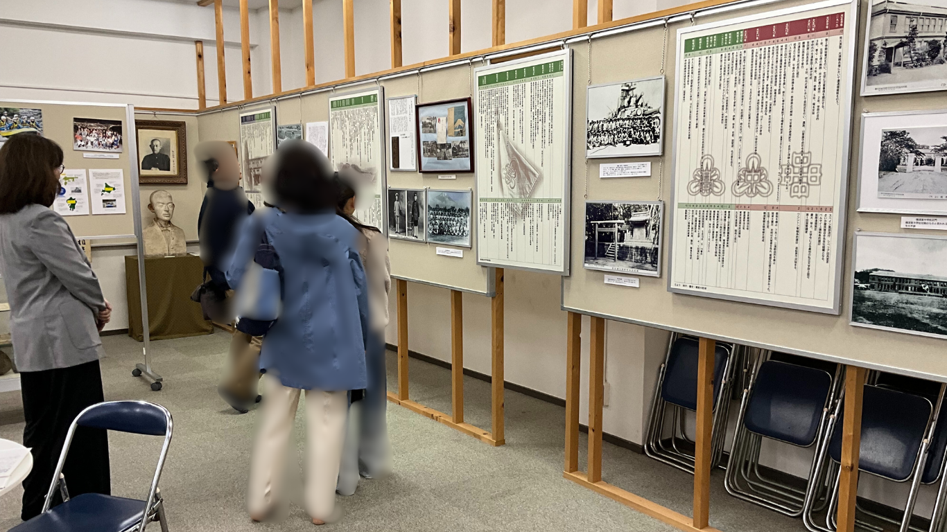 2025年11月8日(土)に学校説明会(中学生と保護者対象)が行われました。説明会終了後、参加者は自由に横高を見学しました。C棟2階にある校史資料室にも約70人が見学に訪れました。今回の見学対応は、村田光男さん(27期)、海浦洋子さん(32期)、大竹英恵会長(34期)でした。