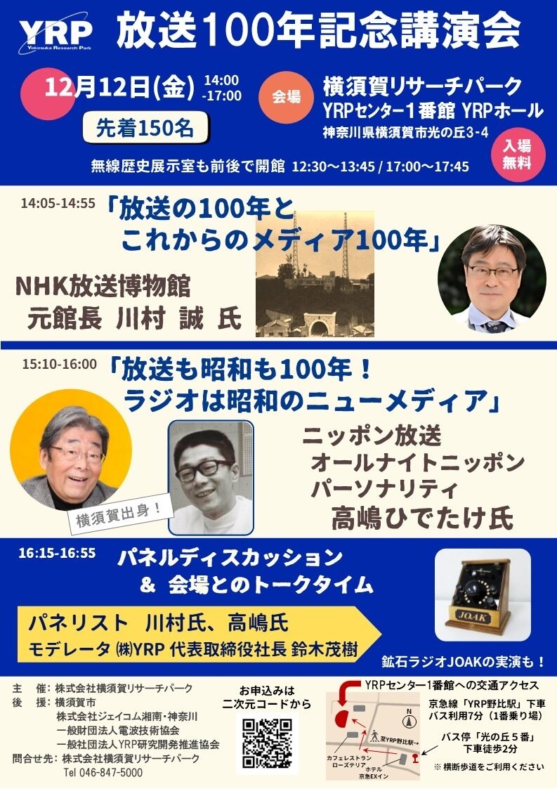 鈴木茂樹さん(27期)が代表取締役社長を務めるYRP(横須賀リサーチパーク)が「放送100年記念講演会」を開催します。